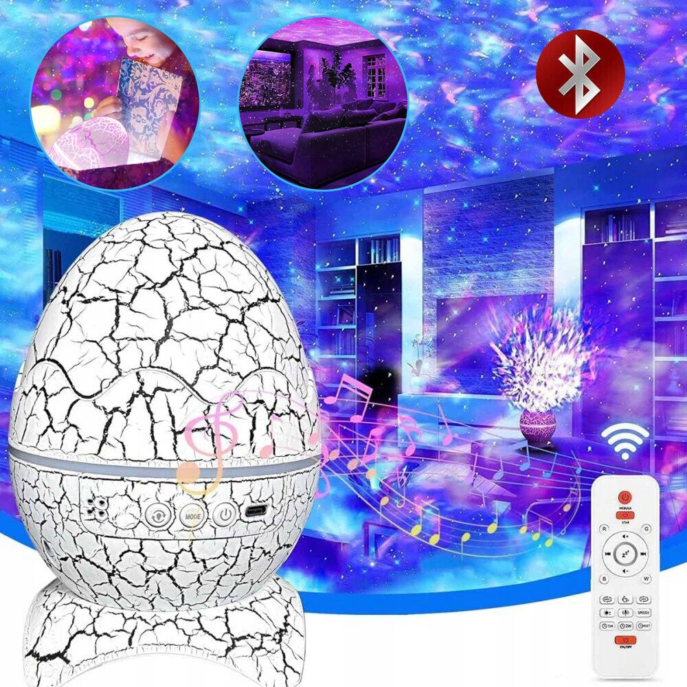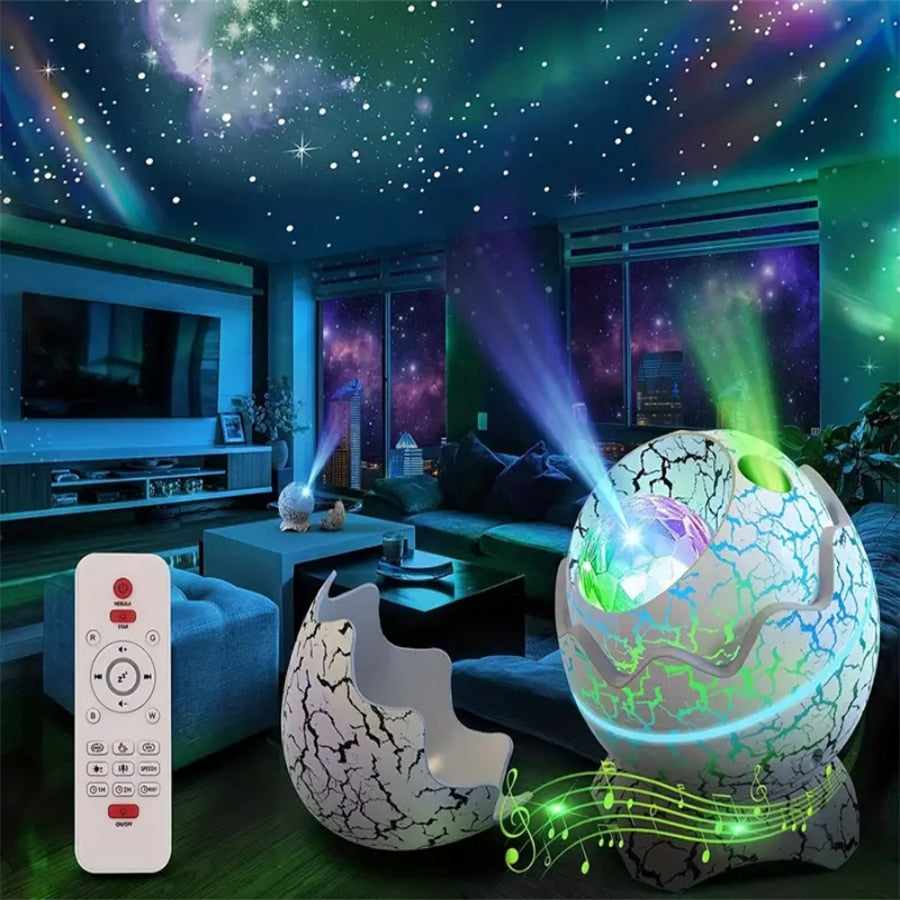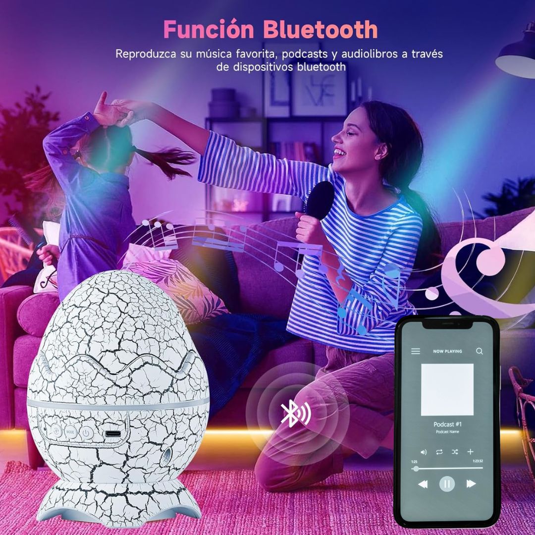 Convierte cualquier habitación en un ambiente mágico y lleno de color con nuestro proyector en forma de huevo de dinosaurio. Su luz LED dinámica y su parlante integrado crean una experiencia única para niños y adultos: relajante, divertida y perfecta para decorar o dormir.